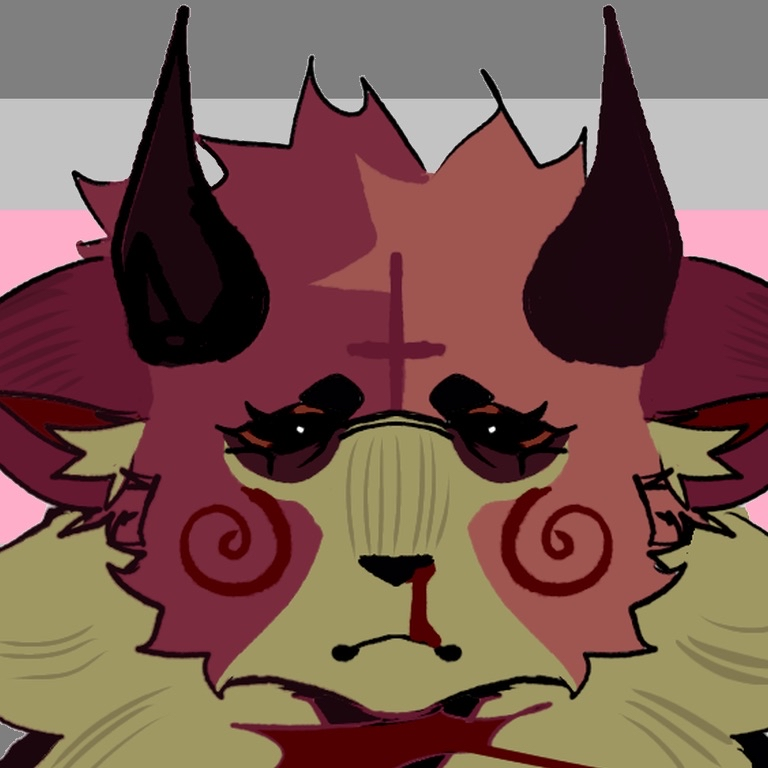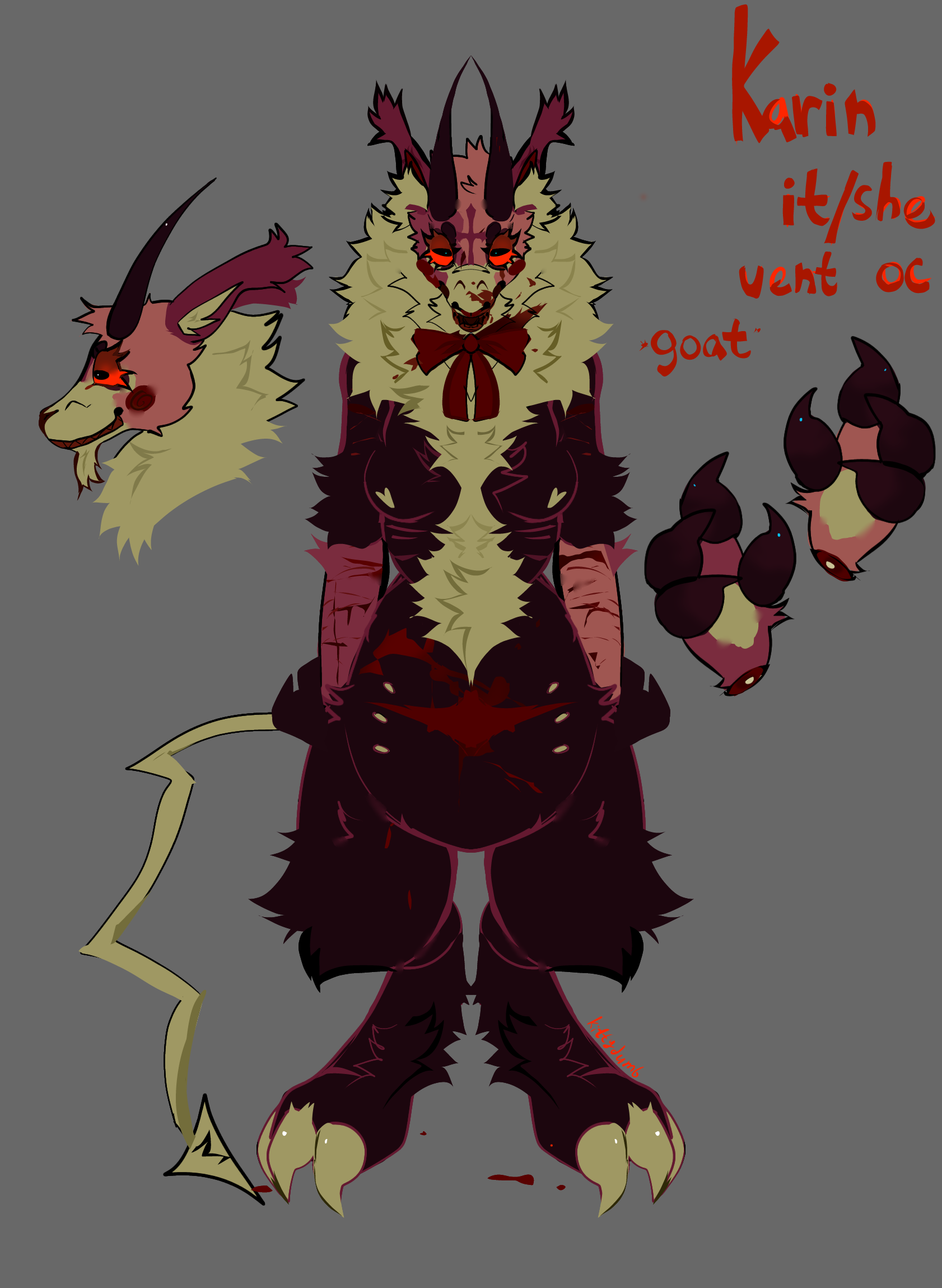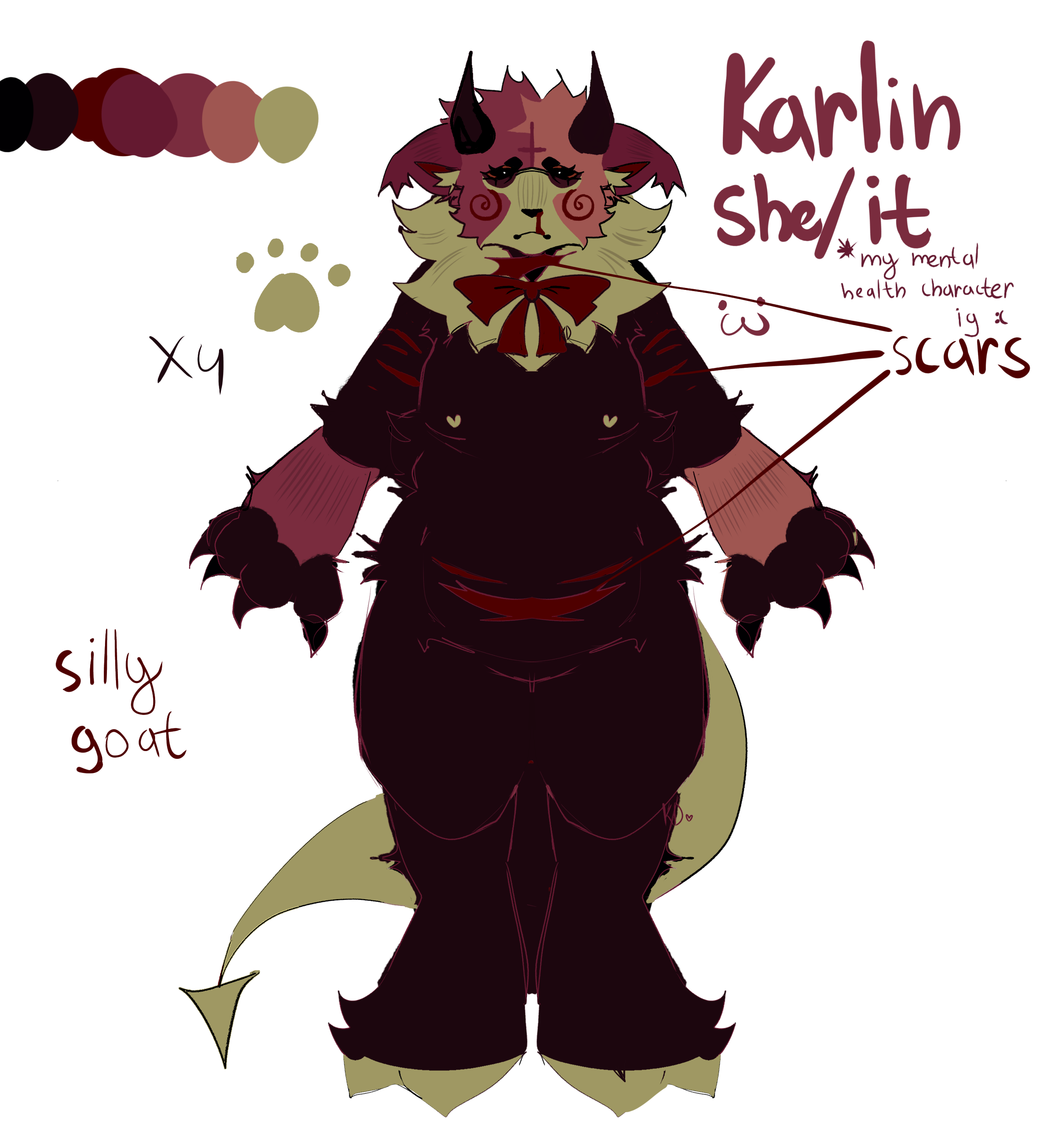 Karlin is the demonic offspring of a goat and a feline. It tried its best to make friends, but were typically shut down. Karlin often spirals into depressive episodes and even transforms into a self-destructive demon form. When in this demon form she loses all sense of self, and becomes a destructive towards itself and others. Her parents used to lock her in the basement when this would happen. Heavy drinker and has impulsive tendencies, but is quiet when she talks (unless she's on television). When Karlin gets a wound, it won't shut and never stops bleeding. She was once an undertaker at her parent's funeral home, but ran away when she was 18 to become an television personality, as the CRT had never gone out of style in her world. She loses her job when she eats her ex on live television and becomes a horrorcow on her world's equivalent of 4chan.