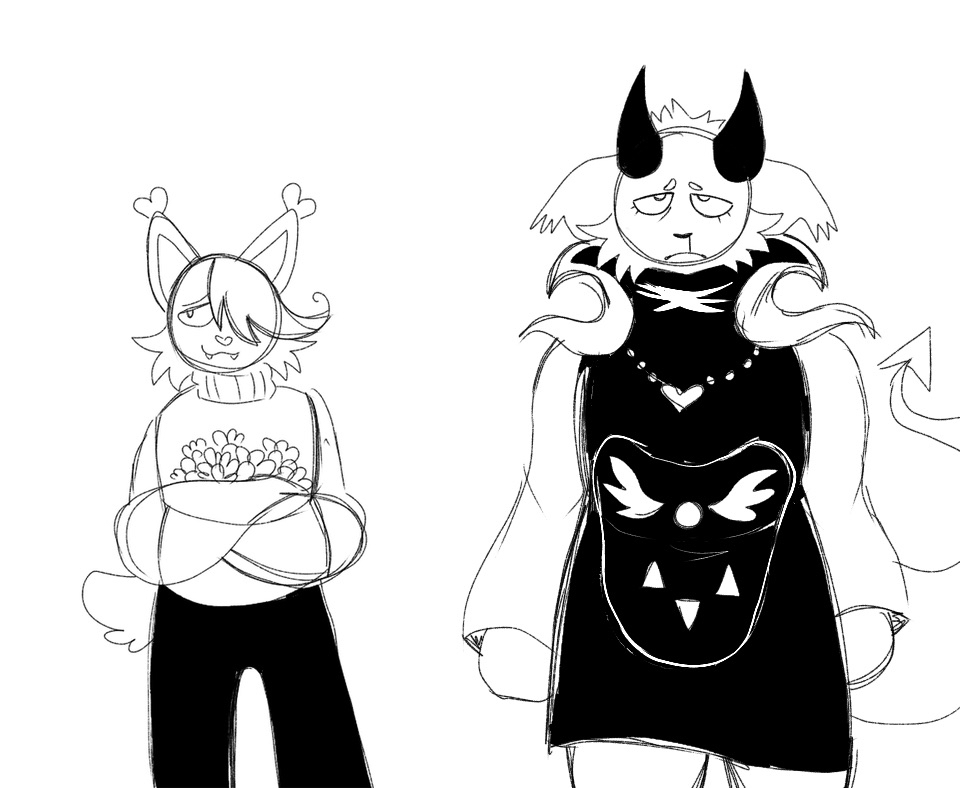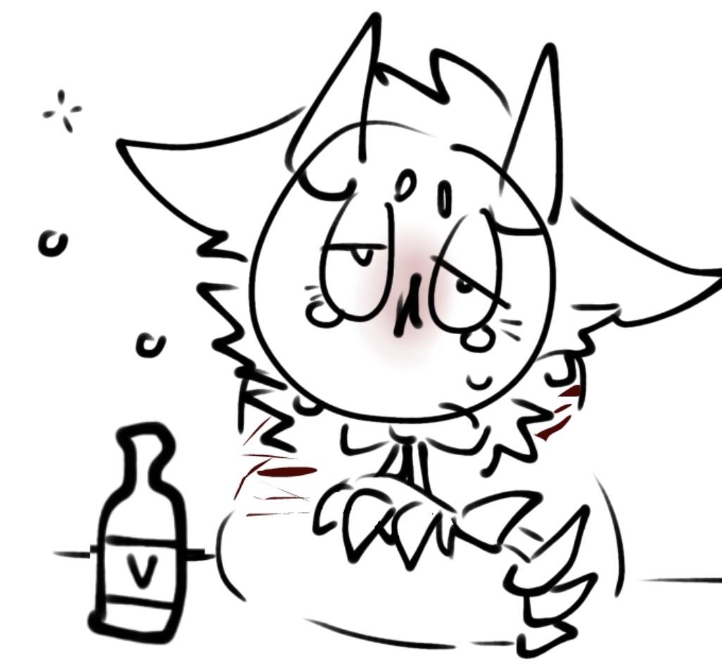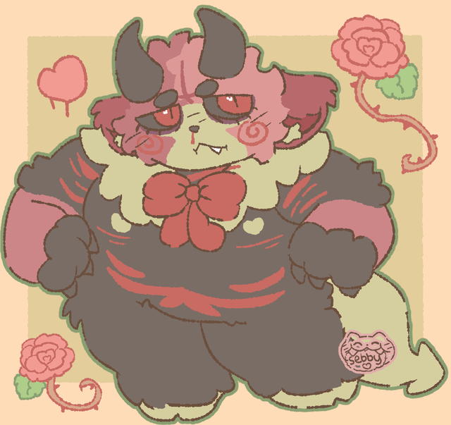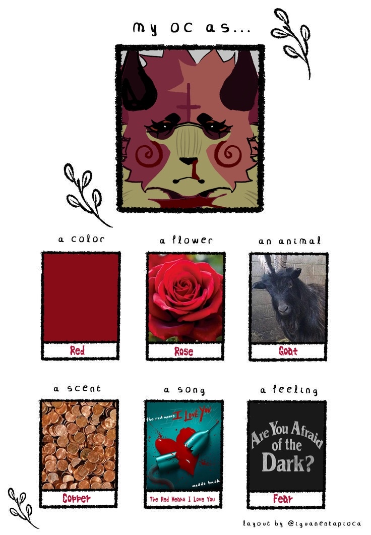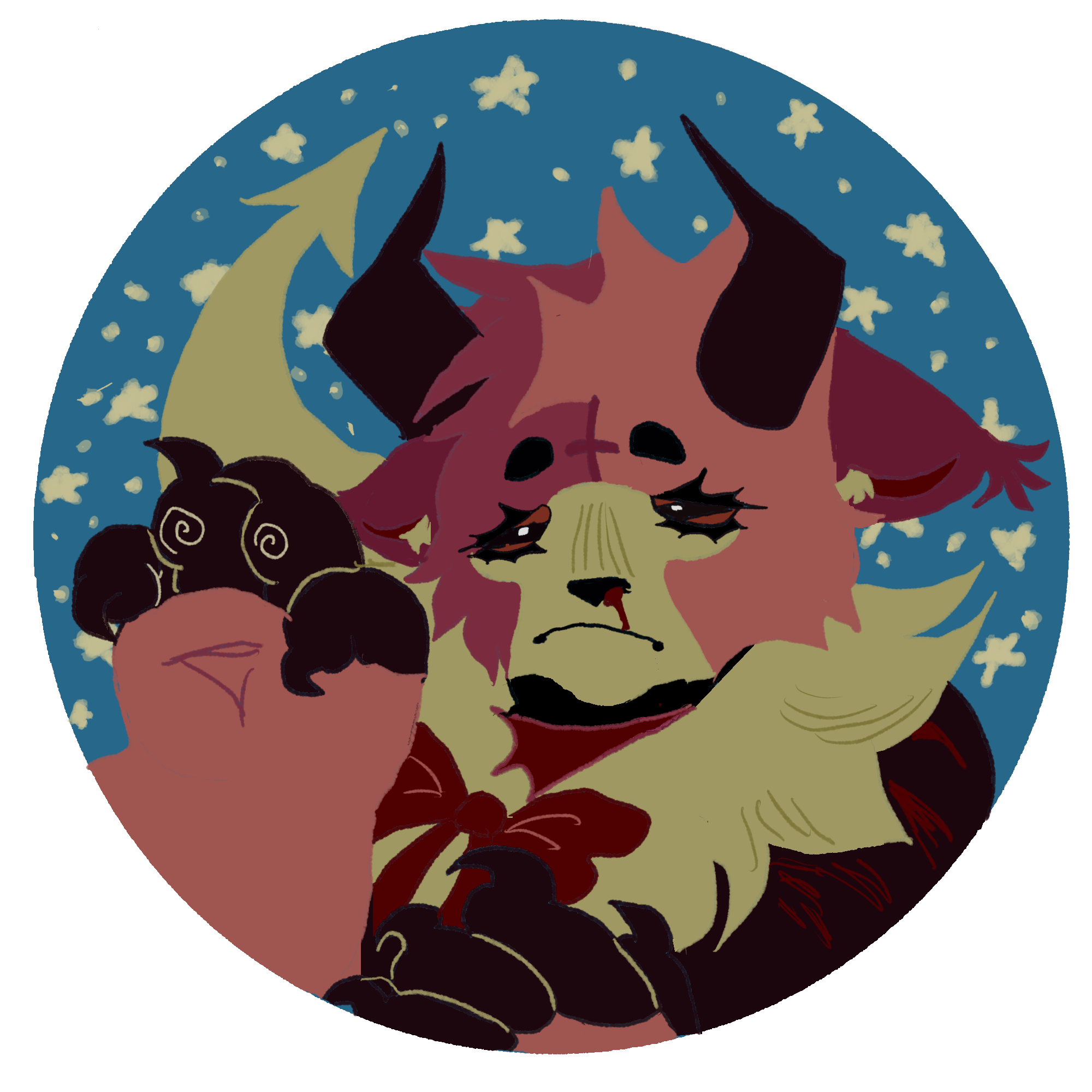 Karlin is the demonic offspring of a goat and a feline. It tried its best to make friends, but were typically shut down. Karlin often spirals into depressive episodes and even transforms into a self-destructive demon form. When in this demon form she loses all sense of self, and becomes a destructive towards itself and others. Her parents used to lock her in the basement when this would happen. Heavy drinker and has impulsive tendencies, but is quiet when she talks (unless she's on television). When Karlin gets a wound, it won't shut and never stops bleeding. She was once an undertaker at her parent's funeral home, but ran away when she was 18 to become an television personality, as the CRT had never gone out of style in her world. She loses her job when she eats her ex on live television and becomes a horrorcow on her world's equivalent of 4chan.